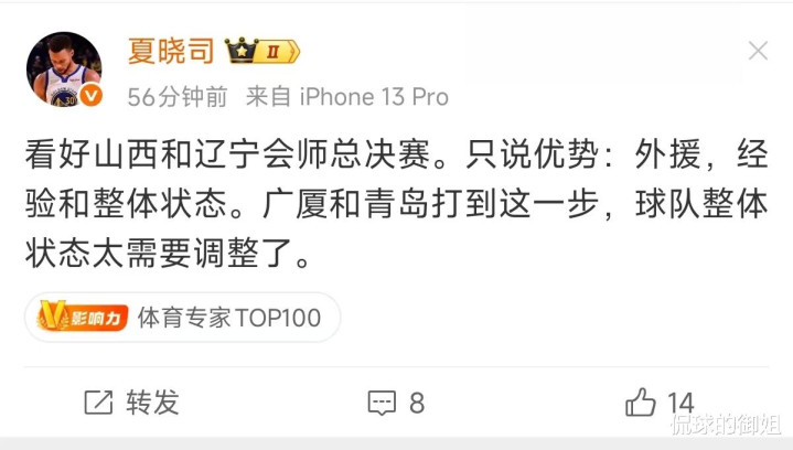 山东体育记者夏晓司发文:看好山西和辽宁会师总决赛。只说优势:外援,经验和整体状态。广厦和青岛打到这一步,球队整体状态太需要调整了。
